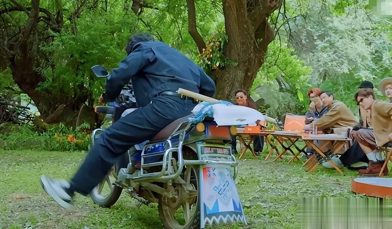 黄景瑜的综艺首秀堪称 “被综艺之神眷顾”,骑摩托车耍帅却连续翻车,打不着火、迷路就算了,最后连支架都放不下来,只能把车放倒在地,从后座掏出擀面杖的名场面,被沈腾调侃 “你是来打野的?”。